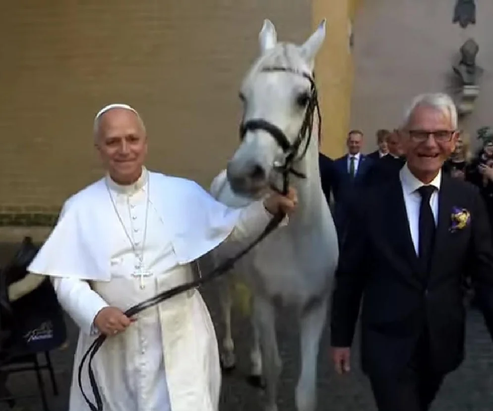 „Jak zobaczyłem zdjęcia przyszłego papieża na koniu w Peru, to urodził się pomysł, że chcę mu podarować pięknego konia arabskiego, który będzie godny, bo biały wiąże się przecież z białą papieską sutanną” – powiedział Vatican News Andrzej Michalski, prezes Stadniny Koni Michalski w Kołobrzegu-Budzistowie. Jak podkreślił, chciał w ten sposób wyrazić wdzięczność i odpowiedzieć na papieski apel o umacnianie miłości przez konkretne gesty.