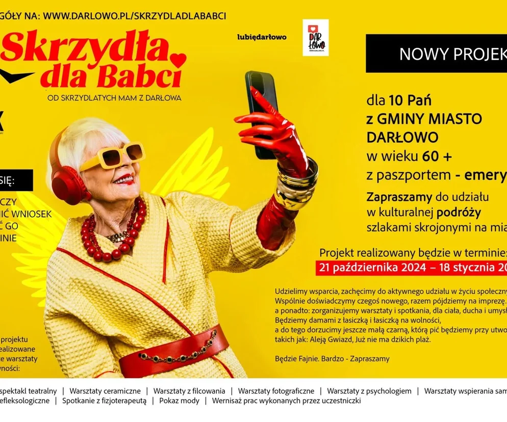 Ma być projektem aktywizującym a zarazem pomostem pomagającym przejść od aktywności zawodowej do nowych aktywności na emeryturze. Projekt jest kierowany do pań, które niedawno nabyły prawa emerytalne i jeszcze nie do końca odnalazły się w zmianie trybu życia. Udział w tej edycji weźmie 10 kobiet, w programie jest ponad 50 godzin spotkań i zajęć warsztatowych. Zgłoszenia można nadsyłać do 28 października. Zajęcia ruszą w listopadzie, by zakończyć się w styczniu 2025, kiedy obchodzony jest dzień babci. Zainteresowane Panie powinny dokonać zgłoszenia poprzez wypełnienie formularza i złożenie go w sekretariacie Darłowskiego Ośrodka Kultury przy ul. Morskiej 56. Formularz i dodatkowe informacje na www.darlowo.pl/skrzydladlababci. W ramach projektu zrealizowane zostaną następujące formy wsparcia: doradztwo trenera personalnego, kurs fotografii połączony z sesją zdjęciową, warsztaty ceramiczne i filcowania. Wspólne kreatywne spędzanie czasu wolnego z kulturalnymi atrakcji, udział w wydarzeniach kulturalnych, organizacja wystawy z wernisażem powstałych w trakcie trwania projektu prac.