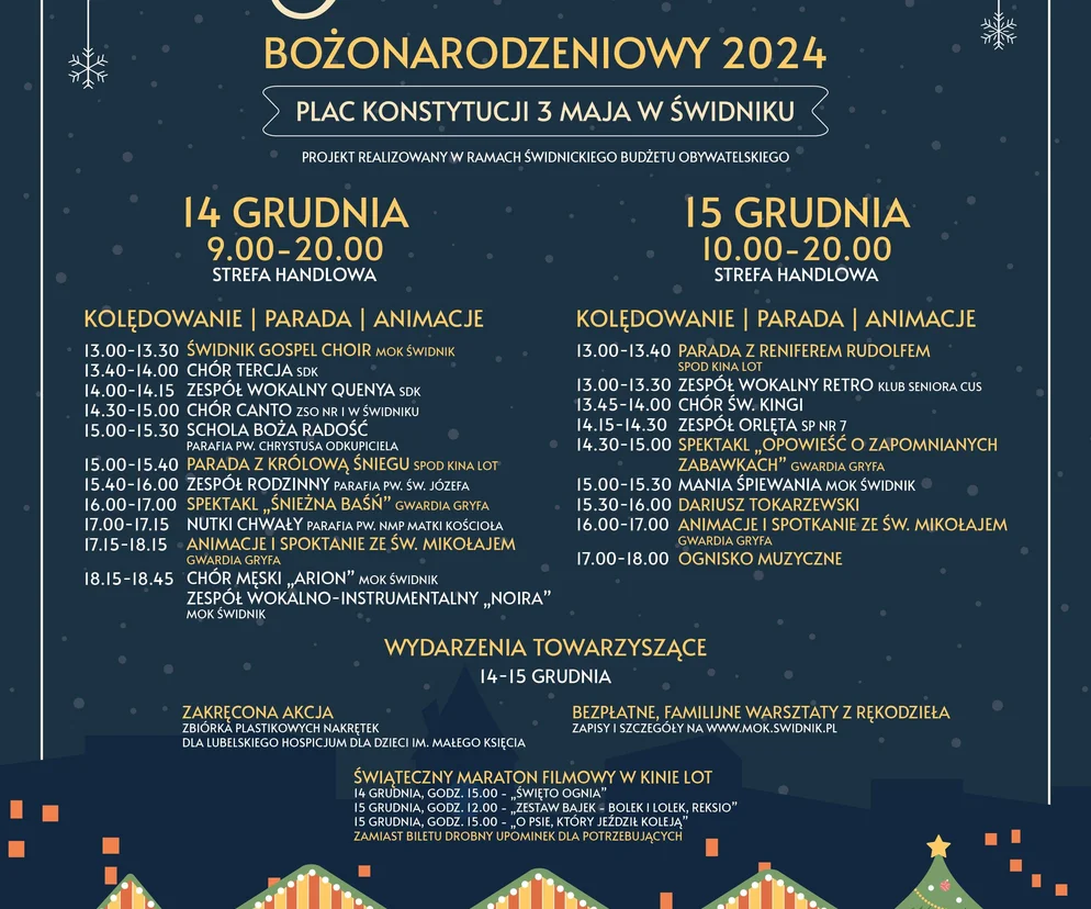 W programie wydarzenia także spektakle uliczne i parady, kolędowanie ze świdnickimi artystami, bezpłatne warsztaty, animacje i spotkania ze Świętym Mikołajem, a także akcje charytatywne i Świąteczny Maraton Filmowy w kinie LOT.