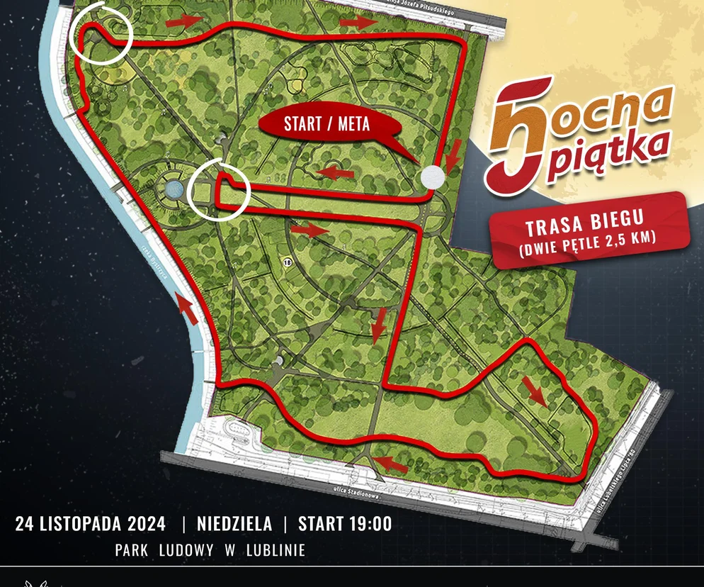 - Znowu zaskakujemy naszych uczestników i organizujemy nocną piątkę. Nocną, czyli przy lampach, w ciemnościach. Myślę, że będzie bardzo atrakcyjnie. Dystans 5 km listopadową porą nocną 24 listopada. Myślę, że będzie fajnie. Biegacze pojawią się w Parku Ludowym i bieg będzie zorganizowany o godzinie 19:00. Oczywiście to bieg dla osób dorosłych i bieg będzie na pętelce 2,5 km. Już biegaliśmy na tej trasie rok temu, aczkolwiek była to dzienna trasa. Fajna trasa, bo będzie widoczna dla kibiców. Z różnych względów decydujemy się na Park Ludowy. Po pierwsze jest to dosyć płaska trasa, więc można rozwinąć fajne prędkości, ale wiem, że biegacze zwracają uwagę na coś innego, czyli na przykład na ostre zakręty. No i nie da się ukryć, że faktycznie trzeba będzie czasami przyspieszyć, czasami zwolnić, ale to też jest atrakcyjnością tej trasy, że jest zmienna, czyli nie ma długich, prostych i się nudzimy, tylko cały czas coś się dzieje, więc można tutaj potraktować ten bieg fajnie jako taki taktyczny, techniczny, ale również właśnie na płaskiej, szybkiej trasie - mówi Piotr Kitliński, jeden z organizatorów zawodów.