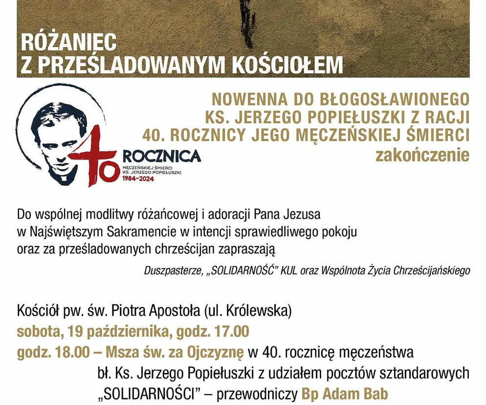 19 października w kościele pw. św. Piotra Apostoła w Lublinie przy ulicy Królewskiej 9, nazwanym „Lubelskim Żoliborzem”, gdzie co miesiąc, od 1984 r. trwa modlitwa za naszą Ojczyznę, odbędą się uroczystości upamiętniające męczeńską śmierć bł. ks. Jerzego. O godz. 17.00 rozpocznie się modlitwa za Kościół prześladowany. O godz. 18.00 odprawiona zostanie Msza Święta za Ojczyznę, której przewodniczył będzie bp. Adama Baba. Uroczystości zakończy modlitwa przy pomniku bł. ks. Jerzego Popiełuszki.
