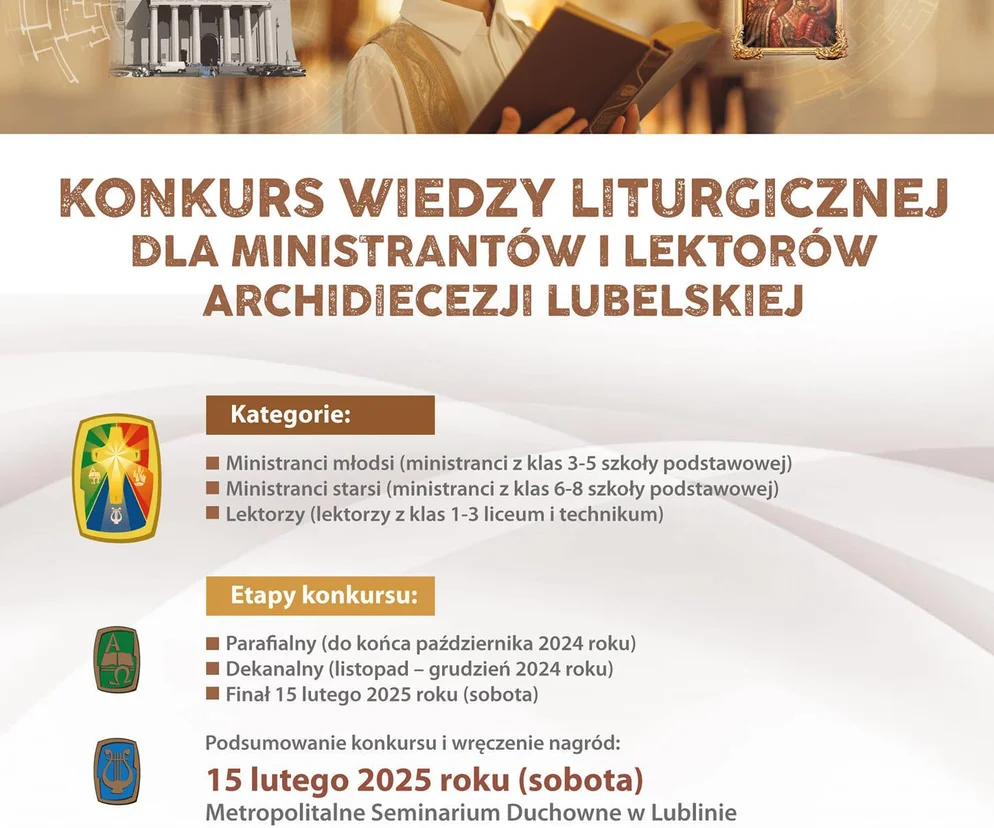 - Wszystkie informacje znajdują się na naszej stronie internetowej lso-diecezja-lublin.pl. Tam są szczegółowe informacje, które dotyczą wszystkich materiałów, z których trzeba skorzystać, żeby przygotować się do takiego konkursu. Ma on trzy etapy. Najpierw etap parafialny w miesiącu październiku. W listopadzie i grudniu będzie etap dekanalny. Najlepsi ministranci i lektorzy, w swoich kategoriach będą zaproszeni z parafii do drugiego etapu w dekanatach. Potem będzie trzeci etap 15 lutego w przyszłym roku. To będą finały z takim spotkaniem tych najlepszych ministrantów i lektorów u nas w Seminarium Duchownym. Wtedy też spróbujemy wyłonić tych najlepszych ministrantów i lektorów, którzy wykażą się i swoją praktyką liturgiczną ale też i wiedzą szczególnie akcentowaną w ogólnym wprowadzeniu do Mszału Rzymskiego i dokumentach Kościoła, które dotyczą liturgii przede wszystkim - dodaje ksiądz Marcin Grzesiak.