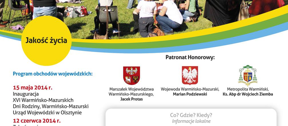 Obchodom XVI Warmińsko-Mazurskich Dni Rodziny towarzyszyć będzie wiele inicjatyw organizowanych przez lokalne samorządy. Organizatorom zależny na inspirowaniu lokalnych środowisk do aktywnego włączania się w przedsięwzięcia przyczyniające się do prawidłowego funkcjonowania rodzin z terenu województwa Warmińsko-Mazurskiego. Szczególnie promowane będą działania okazujące niezastąpioną wartość rodziny. Oficjalne zakończenie XVI Warmińsko-Mazurskich Dni Rodziny odbędzie się 12 czerwca 2014 r. w Giżycku. Organizatorami wydarzenia są Samorząd Województwa Warmińsko-Mazurskiego i Rada ds. Rodzin Województwa Warmińsko-Mazurskiego.
